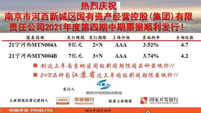 11月1日,集團(tuán)2021年度第四期永續(xù)中票順利發(fā)行,發(fā)行金額12億元,期限3+N年品種7億元,票面利率3.74%;期限2+N年品種5億元,票面利率3.52%,均取得南京市近三年同級(jí)別同品種最低價(jià)格!