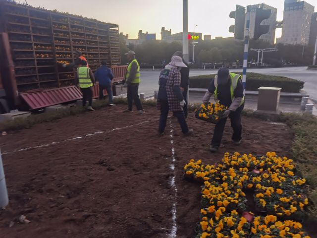 冬季的清晨,寒意逼人,園林工匠們卻干的熱火朝天。清理秋季草花、施肥整地,根據(jù)更換方案,對草花花色進行合理搭配,以求達到花色鮮艷、品種豐富的景觀效果。在植物配置時,進行了圖案設(shè)計,如河西大街長方形套圖、樂山路、奧體大街花境設(shè)計布置等,構(gòu)成了一幅幅靈動活潑的圖畫,不僅美化了城市景觀效果,也為冬季出行的市民呈現(xiàn)了一道靚麗的風(fēng)景線。
