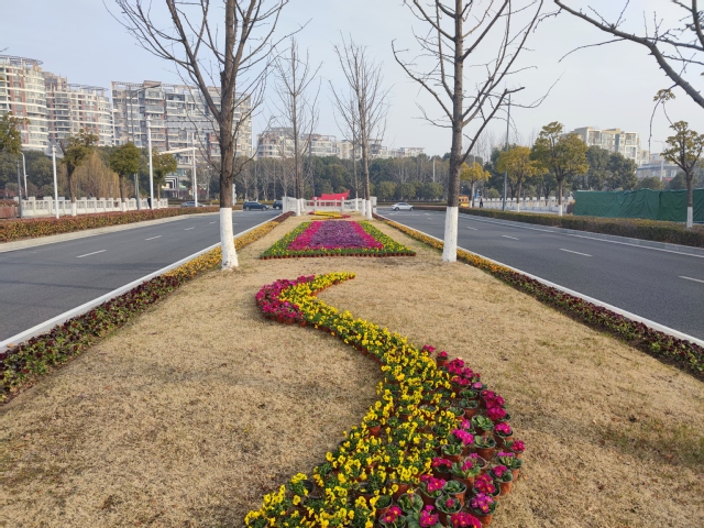 江蘇大劇院北門夢都大街中分帶,喬木造型樹下,鋪滿了粉色紫羅蘭和紫色三角堇花卉,冷暖色系進(jìn)行搭配分外醒目。錦鯉爆竹元素小品和歡度新春字牌,既簡約大氣又凸顯了紅紅火火迎新春的歡樂氣息。