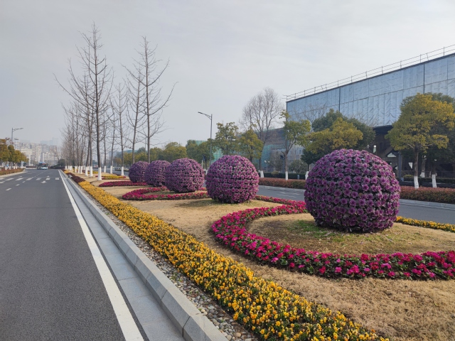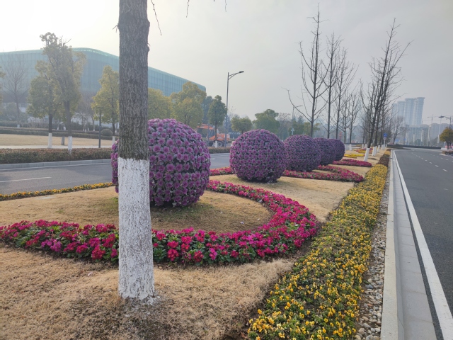 南京奧體中心北門夢都大街人行道旁新增設(shè)一組 “歡度新春”花境式小品生態(tài)微景觀,深紫色羽衣甘藍(lán)與黃色三色堇植物的搭配,簡潔明了,“鯉魚躍龍門”小品和“歡度新春”字樣的組合營造出濃濃的年味。道路中分帶的花球換上了“新裝”,4個巨大的羽衣甘藍(lán)花球在太陽下盡情地綻放著,烘托出了冬奧會的隆重氣氛,寓意在歡度新春佳節(jié)之際,祝愿冬奧會的奧運健兒們能夠魚躍龍門創(chuàng)佳績。