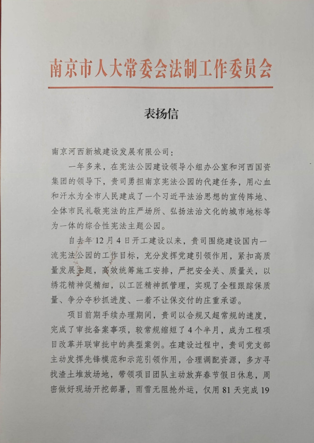 近日,河西集團(tuán)新城公司收到南京市人大常委會(huì)法制工作委員會(huì)表?yè)P(yáng)信,信中對(duì)新城公司順利履約憲法公園項(xiàng)目代建任務(wù)表示了肯定與感謝。