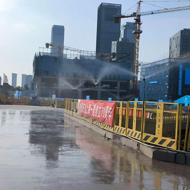 該項(xiàng)目A、B、C區(qū)目前處于底板施工階段,針對(duì)揚(yáng)塵管控,新城公司項(xiàng)目管理團(tuán)隊(duì)嚴(yán)格按照“十達(dá)標(biāo)”管理標(biāo)準(zhǔn)進(jìn)行施工,在出入口規(guī)范設(shè)置沖洗平臺(tái),并配合高壓水槍等設(shè)備對(duì)進(jìn)出車輛進(jìn)行全方位沖洗,杜絕了車輛帶泥上路。施工現(xiàn)場配備霧炮機(jī)、高桿噴淋進(jìn)行360°旋轉(zhuǎn)降塵。同時(shí),項(xiàng)目安排專人對(duì)施工道路進(jìn)行清掃,灑水車不間斷灑水使道路保持濕潤,進(jìn)一步提升工地抑塵效果。
